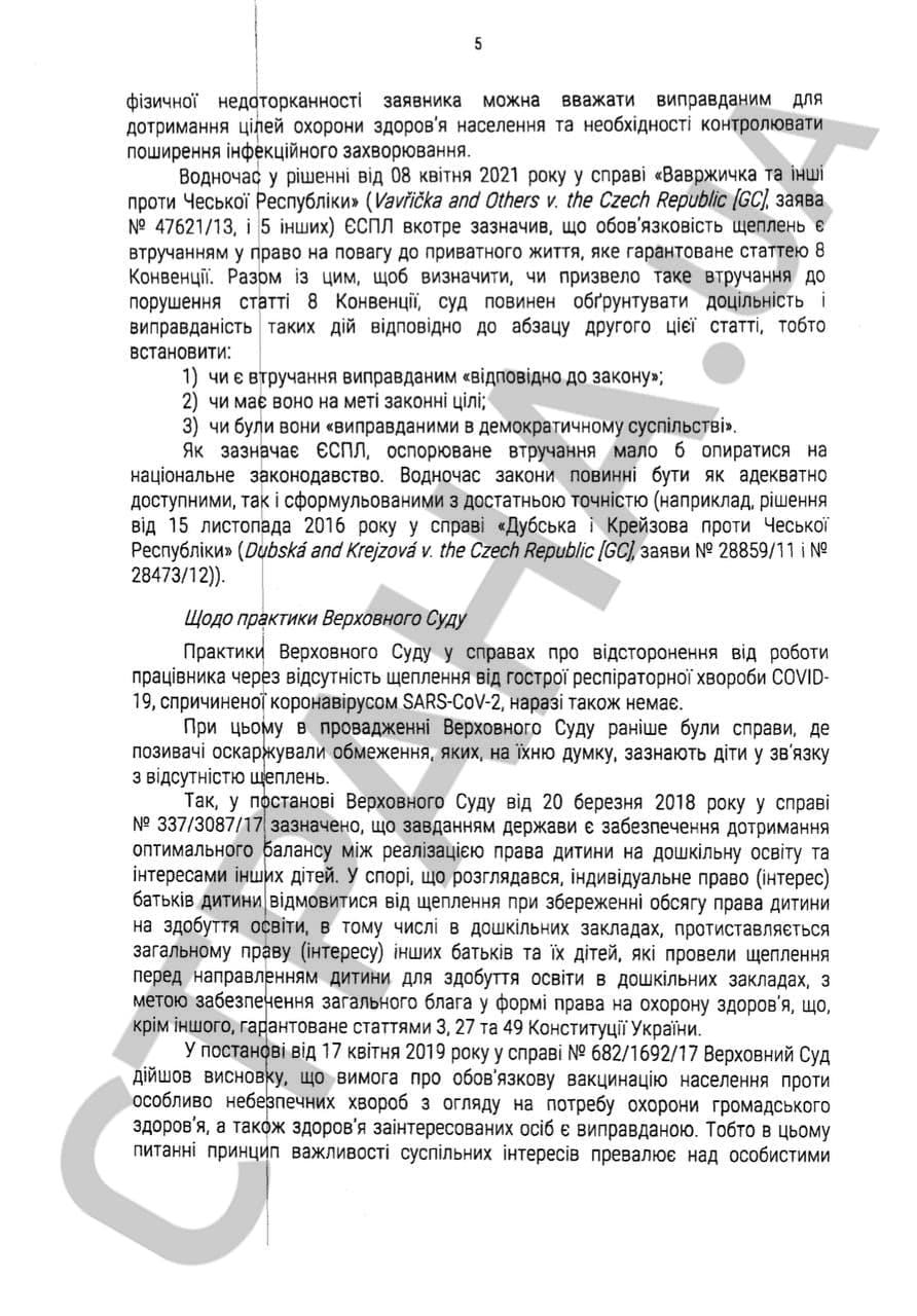 Перечень профессий, предприятий и производств, где необходима вакцинация против инфекционных болезней устанавливается центральным органом исполнительной власти, то есть МОЗ. Таким образом Кассационный суд признаёт законность приказа МОЗ #2153. Гулько отмечает, что законодательством не предусмотрено увольнение непривитого сотрудника, поэтому на время его отстранения за ним сохраняется его рабочее место. При этом законодательство не обязывает руководство предприятий или учреждений выплачивать зарплату отстранённым сотрудникам. Также в документе сказано, что эту позицию следует донести до всех местных и апелляционных судов и учитывать при принятии решений, исходя из обстоятельств каждого конкретного дела.
