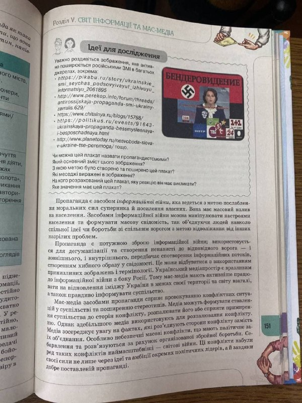 По задумке составителей учебника, школьники во время прохождения раздела "Мир информации и СМИ" должны изучить это изображение и ответить на вопросы, касающиеся определения пропаганды:
