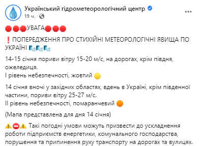 Из-за сильных порывов ветра (15-20 м/с), на дорогах, кроме южных регионов, ожидается гололедица (I уровень опасности, желтый). 14 января днем в Украине местами порывы ветра достигнут 25-27 м/с. В связи с этим синоптики предупредили о втором уровне опасности (оранжевом).