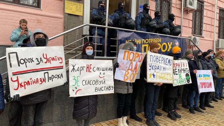 Громко играет музыка, много полиции. Ждут приезда Порошенко. Здесь сторонники экс-президента тоже покреативили с лозунгами на плакатах: "Порох - сила, Зе - могила", "Вернём клоуна в цирк", "Я с порохом".