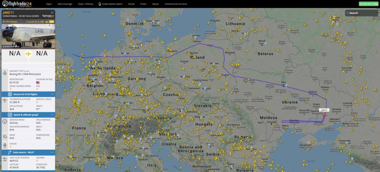 Вдоль линии разграничения на Донбассе активно продолжают летать западные самолёты-разведчики. Сегодня, 18 января, из Британии в Украину прилетел стратегический разведывательный самолет Boeing RC-135W Rivet Joint.