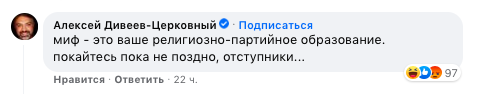 "Миф - это ваше религиозно-партийное образование. покайтесь пока не поздно, отступники..." — написал телеведущий и продюсер Алексей Дивеев—Церковный.