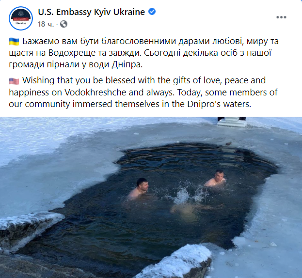 Широкие массы заявление ПЦУ в 2021-м не поддержали. Поздравили украинцев с Крещением и окунулись в прорубь сотрудники посольства США в Украине (они, кстати, делают это регулярно).