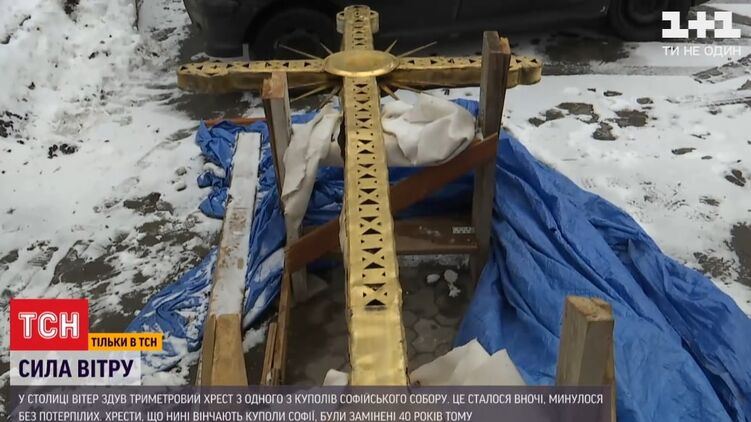 В Киеве сильный ветер сдул крест длиной три метра с одного из куполов Софийского собора. Сейчас его доставили на экспертизу. Инцидент произошел ночью, поэтому никто не пострадал.