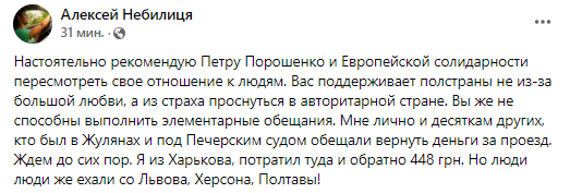 "Настоятельно рекомендую Петру Порошенко и Европейской солидарности пересмотреть свое отношение к людям. Вас поддерживает полстраны не из-за большой любви, а из страха проснуться в авторитарной стране. Вы же не способны выполнить элементарные обещания. Мне лично и десяткам других, кто был в Жулянах и под Печерским судом, обещали вернуть деньги за проезд. Ждем до сих пор. Я из Харькова, потратил туда и обратно 448 грн. Но люди же ехали со Львова, Херсона, Полтавы!", - написал Алексей Небилиця.