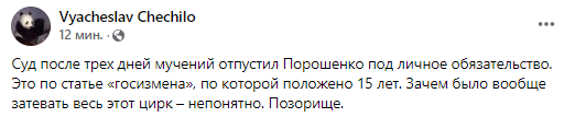 "Суд после трех дней мучений отпустил Порошенко под личное обязательство. Это по статье "госизмена", по которой положено 15 лет. Зачем было вообще затевать весь этот цирк – непонятно. Позорище", - написал украинский журналист Вячеслав Чечило.