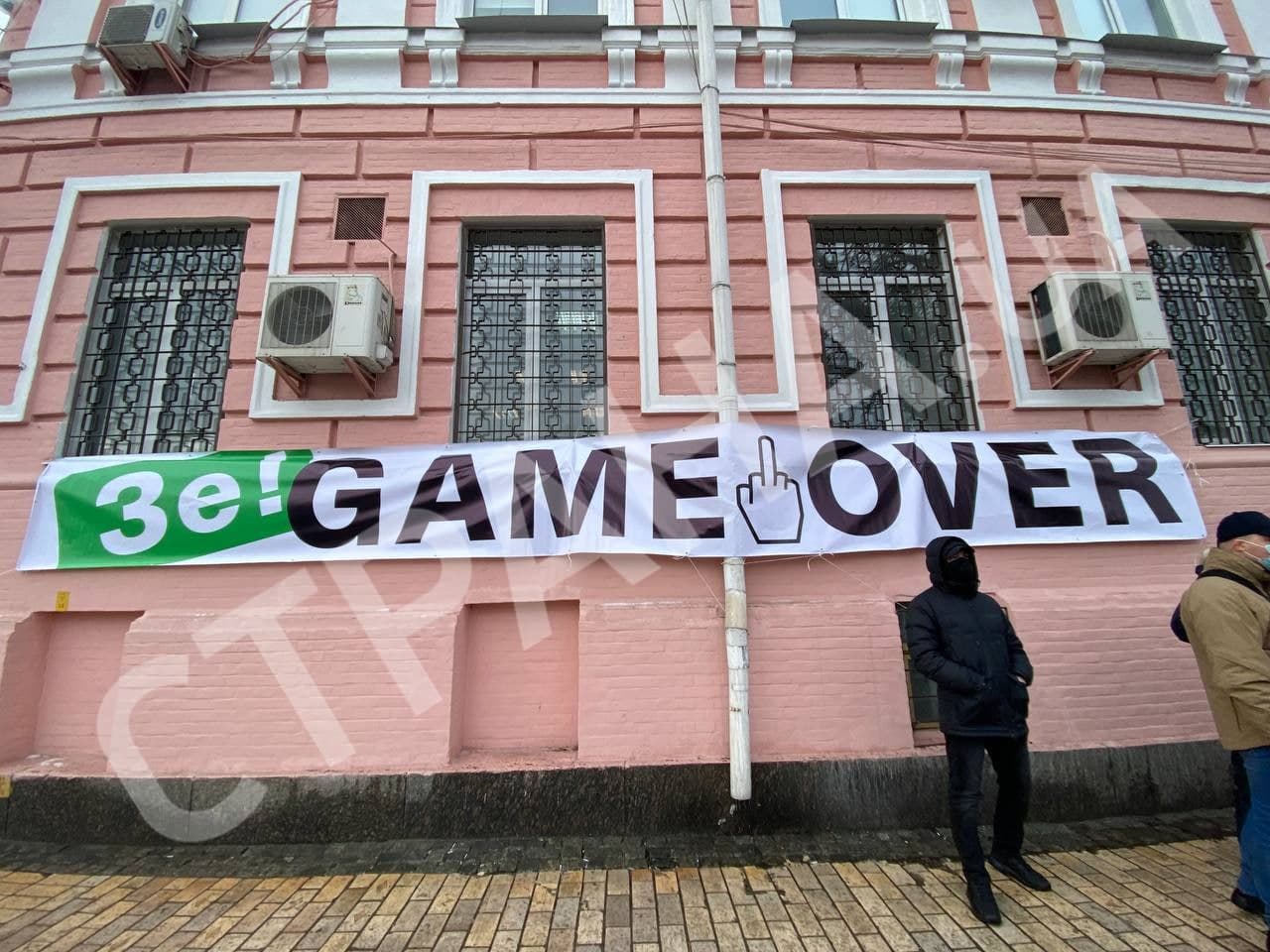 14:05 На здание Печерского суда сторонники Порошенко повесили плакат "Зе game over". На плакате также изображён средний палец.