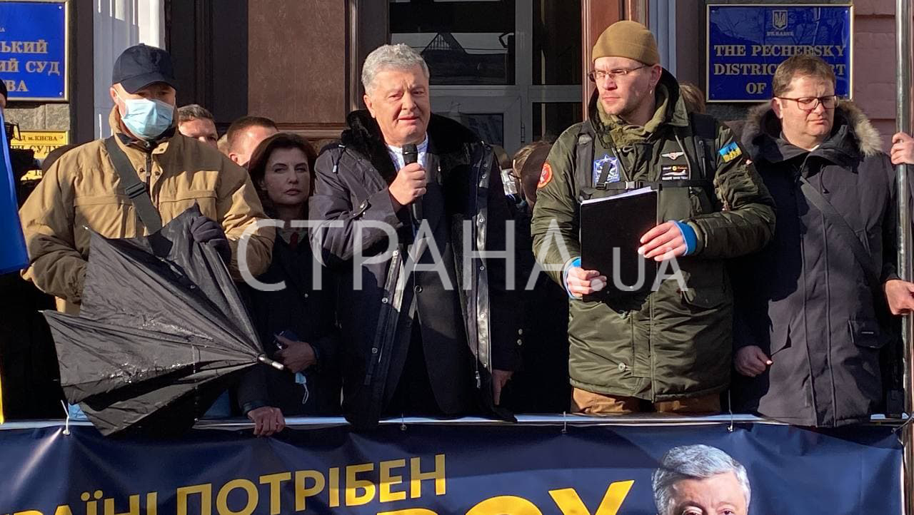 12:49 Под судом началась акция в поддержку пятого президента Украины. Люди подходят ближе к зданию и держат в руках плакаты с надписью: "Руки геть від Порошенка".