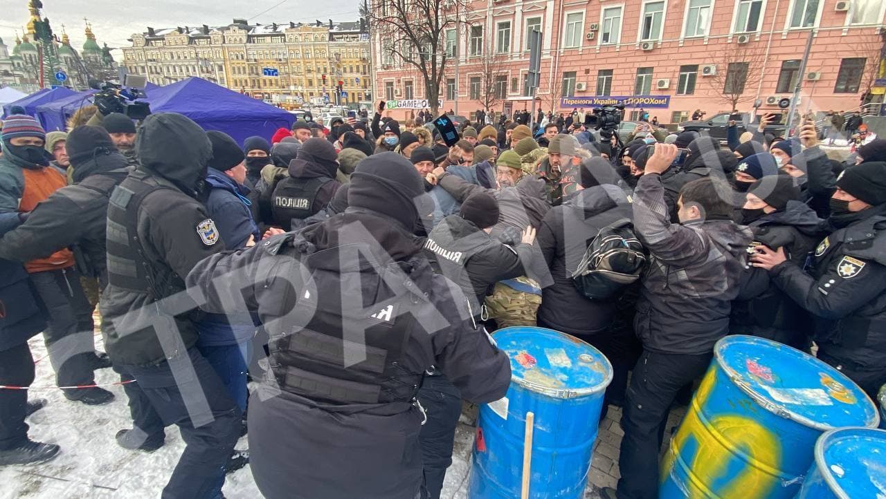 12:37 Под Печерским судом начались новые столкновения, правоохранители пытаться отобрать у сторонников Порошенко бочки, дрова и буржуйки.