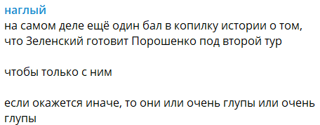 "На самом деле ещё один бал в копилку истории о том, что Зеленский готовит Порошенко под второй тур. Чтобы только с ним.