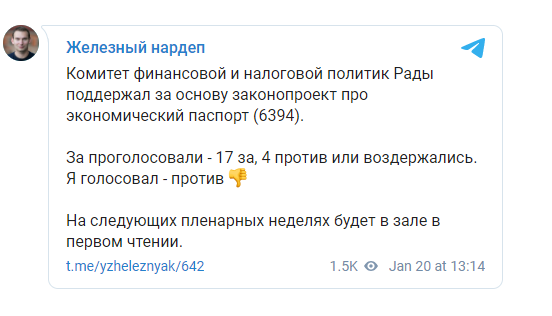 Налоговый комитет Верховной Рады на заседании в четверг, 20 января, рекомендовал народным депутатам поддержать законопроект об экономическом паспорте за основу.