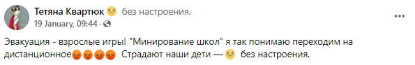 "Эвакуация - взрослые игры! "Минирование школ", я так понимаю, переходим на дистанционное. Страдают наши дети", - написала Тетяна Квартюк з Кривого Рога.