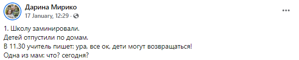 "Школу заминировали. Детей отпустили по домам. В 11:30 учитель пишет: ура, все ок, дети могут возвращаться! Одна из мам: что? сегодня?", - описала происходящее киевлянка Дарина Мирико.