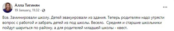 "Все. Заминировали школу. Детей эвакуировали из здания. Теперь родителям надо утрясти вопрос с работой и забрать детей из-под школы. Весело. Средняя и старшие школьники пойдут шариться по району, а для родителей младшей школы - квест", - возмущается Алла Тигинян.