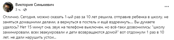 "Отлично. Сегодня, можно сказать 1-й раз за 10 лет решила, отправив ребенка в школу, не заняться домашними делами, а вернуться в постель и ещё вздремнуть.... Вы думаете удалось? Нет 15 минут сна, звук на телефоне выключен, но всё-таки дозвонились: "Школу заминировали, всех эвакуировали и дети возвращаются домой" вот отдохнули 1 раз в 10 лет, не дали нарушить устои..." - иронизирует Виктория Синькевич.