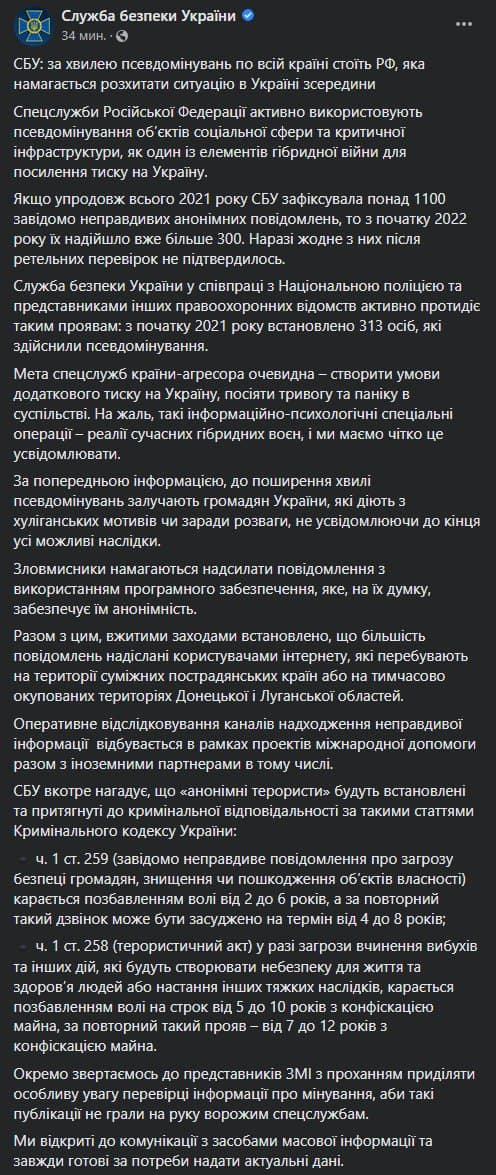 "Спецслужбы Российской Федерации активно используют псевдоминирование объектов социальной сферы и критической инфраструктуры как один из элементов гибридной войны для усиления давления на Украину", - сообщают в СБУ, констатируя, что с начала года (т.е. менее чем за 3 недели) было 300 таких сообщений (а за весь прошлый год - 1100)", - сообщили в пресс-службе ведомства.