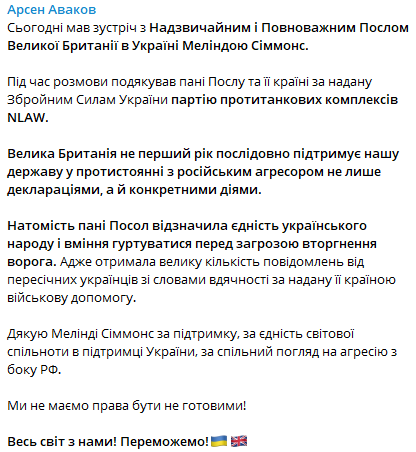 По словам Авакова, Мелинда Симмонс в ответ "отметила единство украинского народа и умение сплачиваться перед угрозой вторжения врага. Ведь получила большое количество сообщений от рядовых украинцев со словами благодарности за оказанную страной военную помощь".