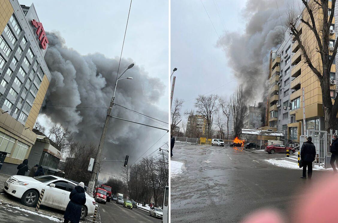 За зданием загорелось и припаркованное авто, по словам очевидцев, кусок горящего пластика упал на машину.