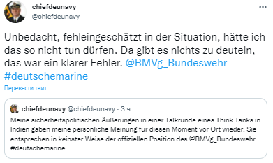 Заявление командующего Военно-морскими силами Германии вице-адмирала Кай-Ахим Шенбаха о том, что Крым больше никогда не присоединится к Украине, вызвало негодование в федеральном правительстве. А сам военный принялся оправдываться за него в соцсети.