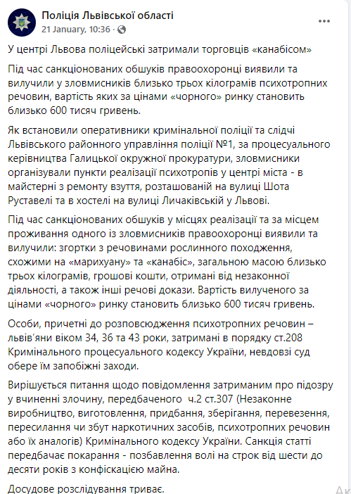 Причастные к распространению психотропных веществ являются львовянами 34, 36 и 43 года. Их задержали в порядке ст. 208 Уголовного процессуального кодекса Украины, вскоре суд изберет им меры пресечения.