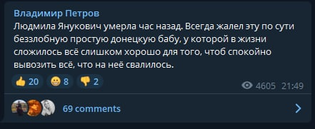 Сегодня Владимир Петров дополнил сообщение. По его словам, смерть Людмилы Янукович якобы произошла после вакцинации "Спутником".