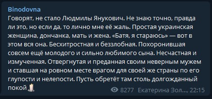 О смерти супруги Януковича Петров написал у себя в Telegram-канале еще вчера.