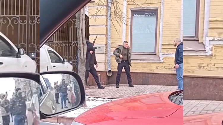 На видео с места событий происходит конфликт между группой мужчин. Один из них вооружен автоматом Калашникова, а другой представляется сотрудником Службы безопасности Украины.