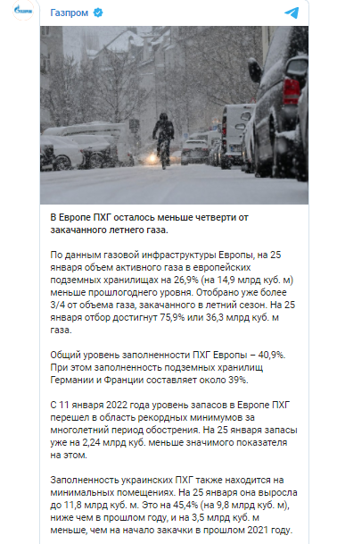 Также отмечается, что с 11 января 2022 года уровень запасов в европейских ПХГ перешел в область рекордных минимумов за многолетний период наблюдений. А по состоянию на 25 января запасы уже на 2,24 млрд куб. м меньше минимального показателя на эту дату.