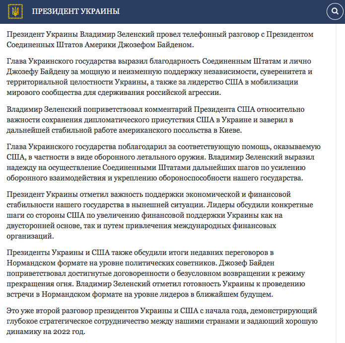 "Президент Байден заявил о поддержке Соединенными Штатами усилий по урегулированию конфликта в Нормандском формате, выразив надежду, что подтверждение сторонами 26 января условий прекращения огня от июля 2020 года поможет снизить напряженность и продвинуть выполнение Минских соглашений", — написал Байден.