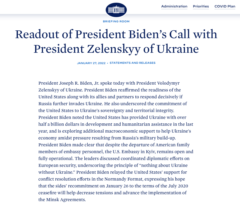 Вашингтон начал свой релиз с того, что президент "Байден подтвердил готовность Соединенных Штатов вместе со своими союзниками и партнерами решительно отреагировать, если Россия продолжит вторжение в Украину".