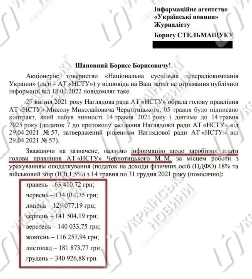 "...предоставляем информацию о заработной плате председателя правления АО "НОТУ" Чернотицкого Н.Н. по месту работы с учетом налогообложения (налог на доходы физических лиц (НДФЛ) 18% и военный сбор (ВС) 1,5%) с 14 мая по 31 декабря 2021 года (помесячно):