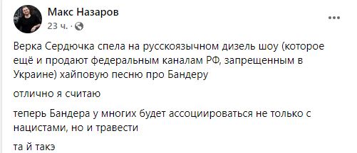 "Верка Сердючка спела на русскоязычном дизель шоу (которое ещё и продают федеральным каналам РФ, запрещенным в Украине) хайповую песню про Бандеру. Отлично я считаю. Теперь Бандера у многих будет ассоциироваться не только с нацистами, но и травести. Та й такэ", - написал телеведущий Макс Назаров.