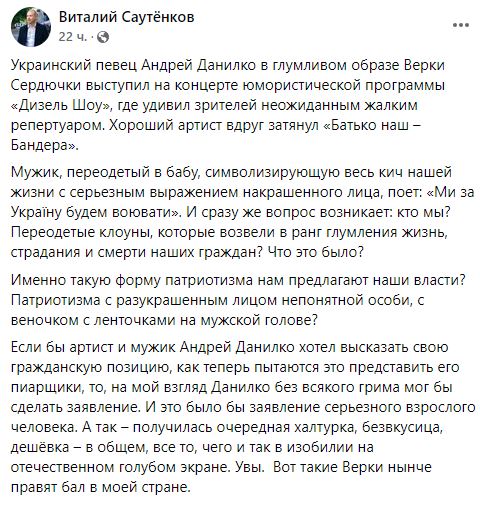 Если бы артист и мужик Андрей Данилко хотел высказать свою гражданскую позицию, как теперь пытаются это представить его пиарщики, то, на мой взгляд, Данилко без всякого грима мог бы сделать заявление. И это было бы заявление серьезного взрослого человека. А так – получилась очередная халтурка, безвкусица, дешёвка – в общем, все то, чего и так в изобилии на отечественном голубом экране. Увы. Вот такие Верки нынче правят бал в моей стране", - написал депутат одесского горсовета Виталий Саутенков.