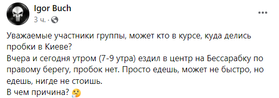 "Уважаемые участники группы, может кто в курсе, куда делись пробки в Киеве?