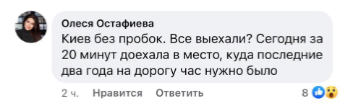 "Такая картина всю эту неделю, пробок нету и машин в разы меньше на дорогах Киева", - отвечает ему пользователь Дмитрий Котенев.