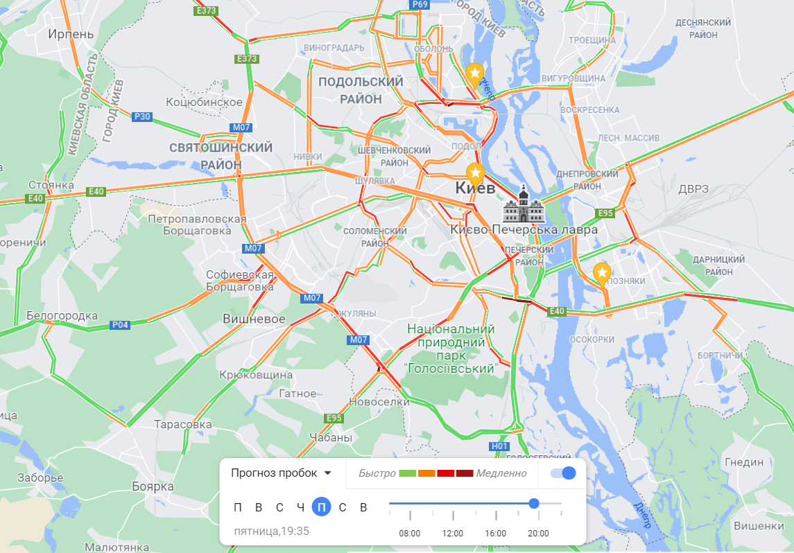 При этом заторы в столице, конечно, остались. Но, судя по всему, они стали меньше. Сервис прогноза пробок от Google Maps показывает следующую картину по Киеву на вечер пятницы.