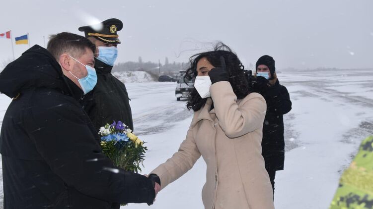 Анита Ананд прилетела в Украину с делегацией. В Киеве делегацию встречал заместитель министра обороны Александр Полищук.