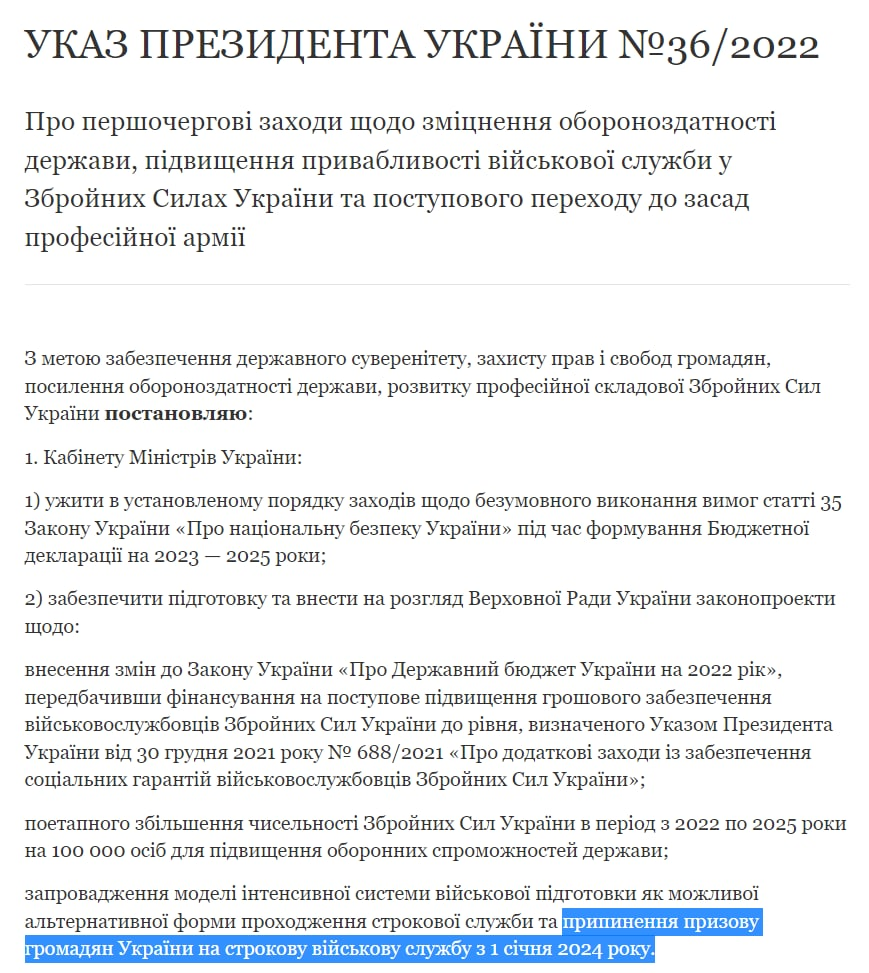 "Кабинету Министров Украины: внедрение модели интенсивной системы военной подготовки как возможной альтернативной формы прохождения срочной службы и прекращение призыва граждан Украины на срочную военную службу с 1 января 2024 года", - говорится в тексте Указа.