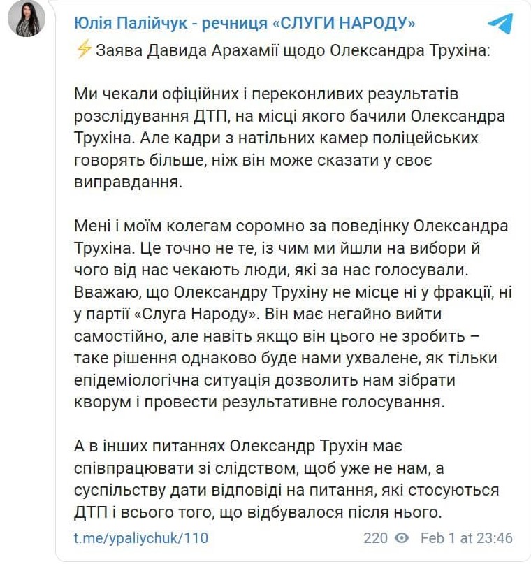 Новые вскрывшиеся подробности скандального ДТП на корню всё поменяли. Трухина уже исключили из партии "Слуга народа" и скоро исключат из фракции (это уже анонсировал глава фракции Арахамия). Судя по всему, ему теперь точно объявят подозрение. Причем не только по статье за ДТП, но и за попытку дать взятку должностному лицу. Венедиктова уже открыла по этому поводу уголовное дело и поручила его расследовать НАБУ.