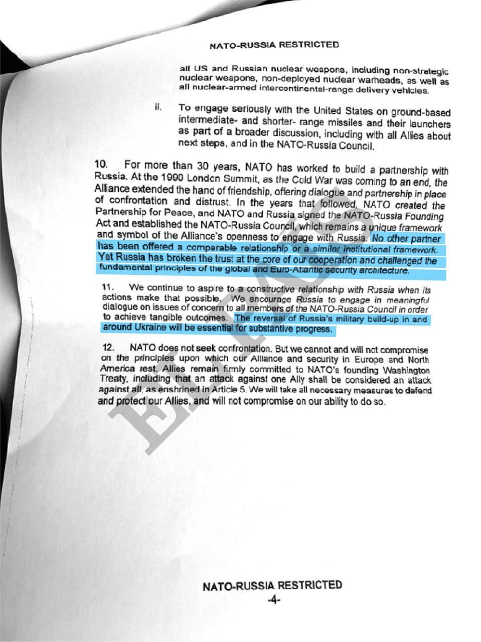 Важный пункт предложения НАТО - "Россия выводит войска из Украины, Грузии и Молдавии, где они были развернуты без согласия принимающей стороны". Отметим, что этой формулировки нет в ответе США. И это показательный момент. То есть Вашингтон не ставит Москве заведомо невыполнимых условий и не увязывает их с остальными пунктами своих предложений.