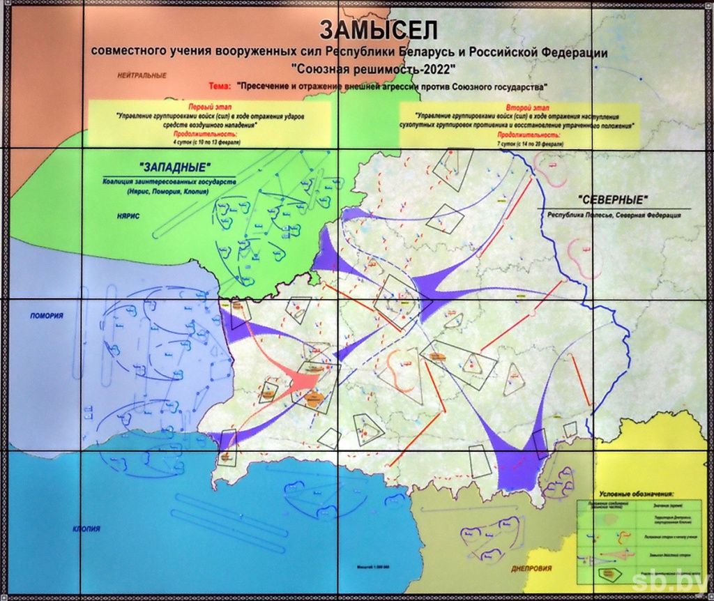 Сценарий учений такой: коалиция "Западных" (Нярис, Помория, Клопия и подконтрольные им террористические организации) дестабилизирует обстановку в Республике Полесье (предположительно это Беларусь) и провоцируют вооруженный конфликт с Республикой Днепровия (предположительно Украина).