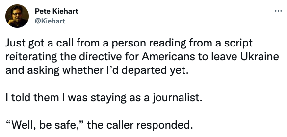 "Только что мне звонил человек, который читал готовый текст, повторяя директиву американцам оставить Украину и спрашивала, покинул ли я уже страну. Ну, будьте в безопасности", - сказал он.