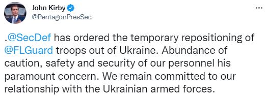 Также о том, что США временно выводят военных инструкторов из Украины в Twitter написал пресс-секретарь Пентагона Джон Кирби.