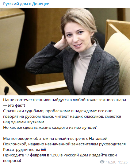 "Наши соотечественники найдутся в любой точке земного шара — это факт! С разными судьбами, проблемами и надеждами: все они говорят на русском языке, читают наших классиков, смеются над одними шутками. Но как же сделать жизнь каждого из них лучше? Мы поговорим об этом на онлайн-встрече с Натальей Поклонской, недавно назначенной заместителем руководителя Россотрудничества", - говорится в сообщении.
