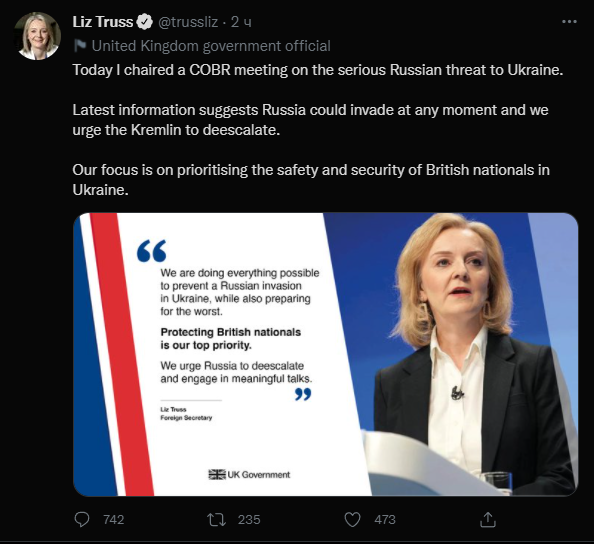 "Согласно последним данным, Россия может вторгнуться в любой момент, и мы призываем Кремль к деэскалации. Мы уделяем приоритетное внимание обеспечению безопасности граждан Великобритании в Украине", — сообщила она.