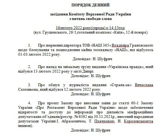 Кроме этого, на заседании комитета  рассмотрят вопрос блокировки телеканала "НАШ", против которого СНБО ввёл санкции, а также обсудят нападение на съёмочную группу "Украинской правды" в Днепре.