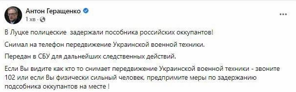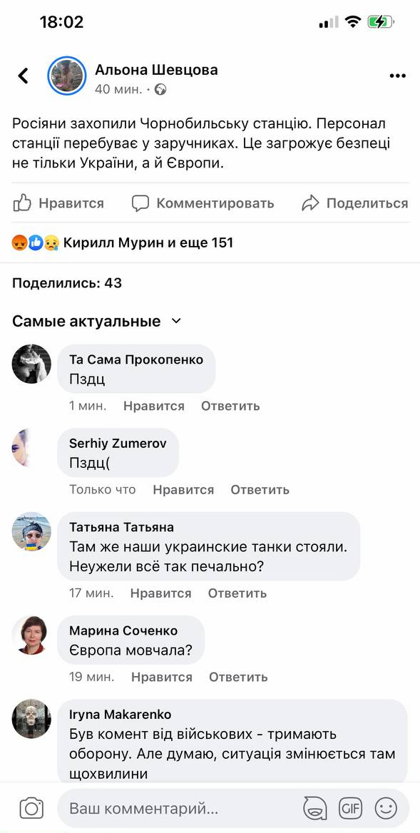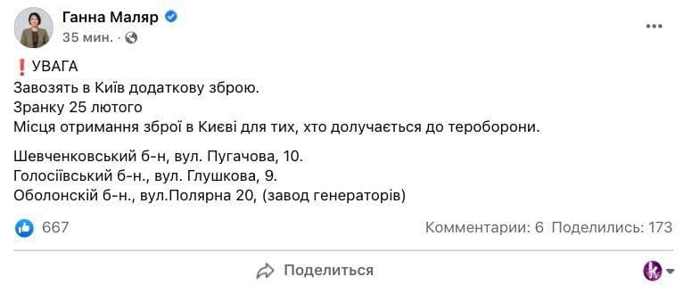 01:18 - Заместитель министра обороны Маляр написала, что завтра в Киев завезут дополнительные партии оружия и написала, где его получить, тем, кто записался в отряды теробороны.