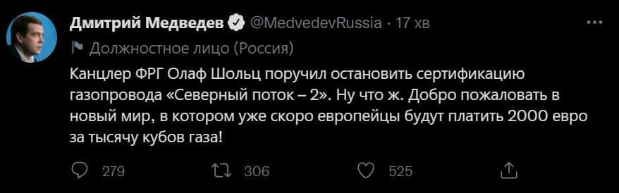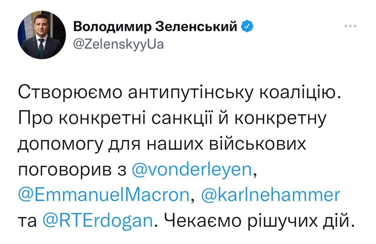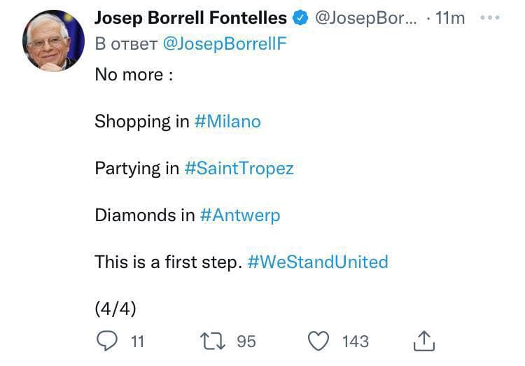23:42 Зеленский потребовал от лидеров ЕС ввести действительно жесткие санкции против России - отключить от SWIFT и наложить эмбарго на импорт российских энергоносителей.
