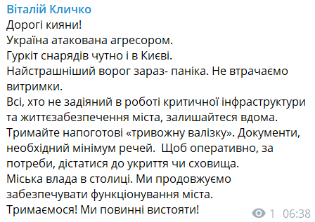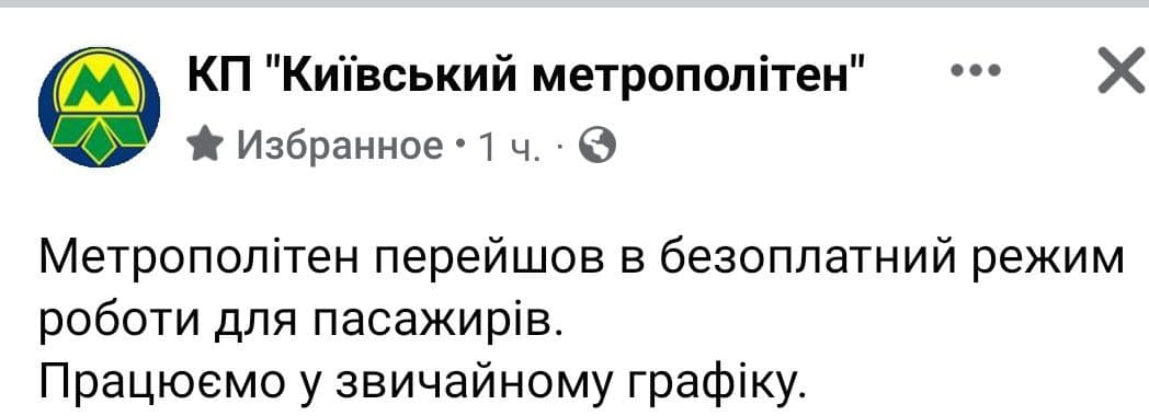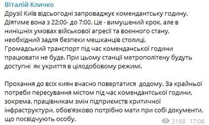 20:38 "Транспорт в Киеве ездит. Проезд бесплатный. Но призываю ним пользоваться только тех, кто работает на приедприятиях критической инфраструктуры. Остальных призываю оставаться дома. В случае тревоги прошу спускаться в метро. Во время комендантского часа транспорт работать не будет, но метро будет открыто как укрытие", - Виталий Кличко на брифинге.