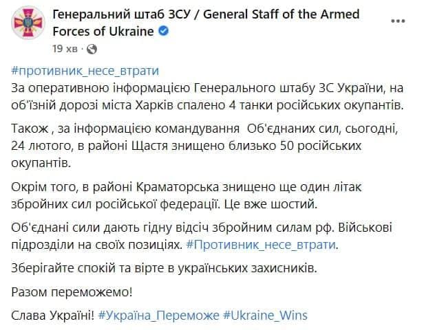 01:12 - Главнокомандующий ВСУ Валерий Залужный подвел итоги первых суток российского вторжения. По его словам, РФ 24 февраля потеряла более 30 танков, 130 боевых бронированных машин, семь самолетов и шесть вертолетов.